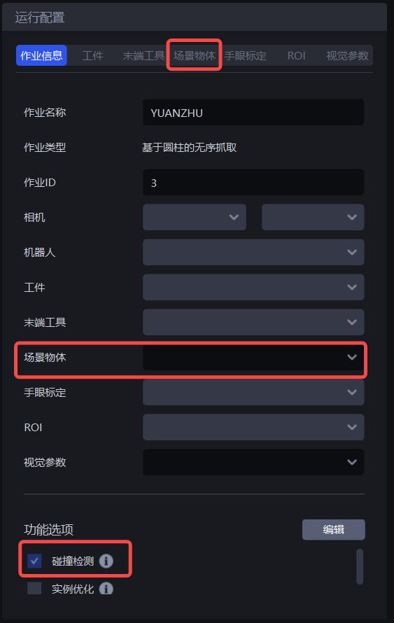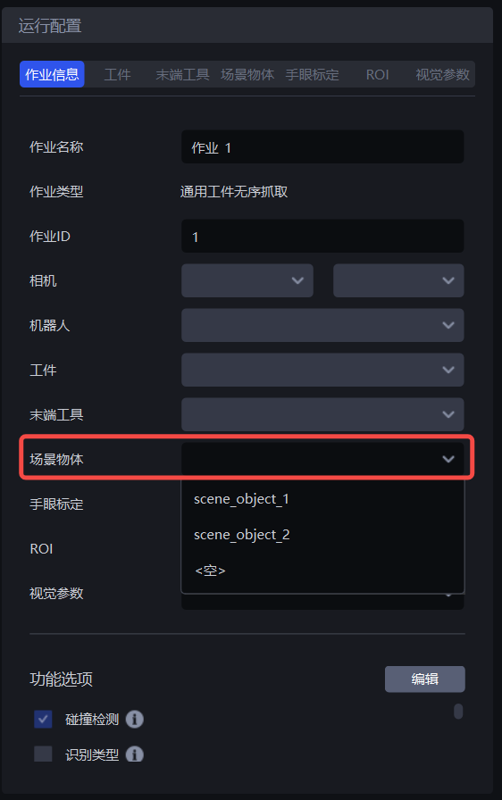 配置好场景物体后,在作业信息的场景物体下拉框选择当前作业绑定的场景物体。