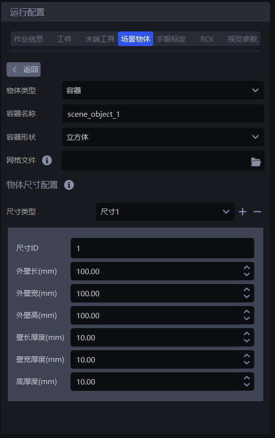 物体类型:场景物体类型,当前仅有容器一种类型容器名称:用于标识当前容器容器形状:当前仅有立方体一种形状网格文件:可选项。当来料存在料框,可上传料框的网格文件,使用一键联通训练视觉模型或双目成像模型时,在仿真环境中生成料框数据模拟来料方式,可增强对料框和料框内工件的识别。