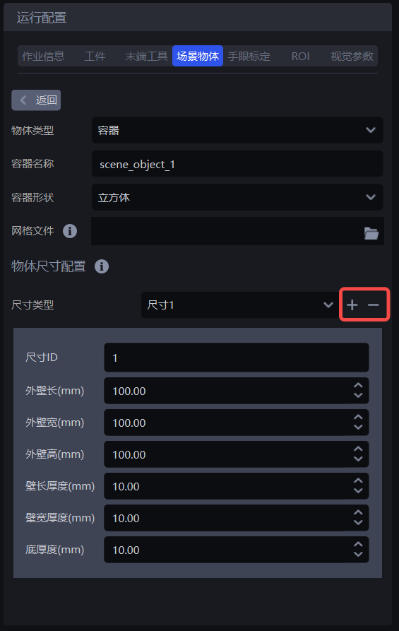 物体尺寸配置:配置料框的尺寸先验。料框检测时,根据尺寸先验拟合四边形得到料框的模板点云,与料框的场景点云进行精匹配得到最终姿态;若场景中存在多种尺寸的料框,可针对同一场景物体设置不同的尺寸先验,点击"+""-"可新增、删除尺寸先验,如下图所示。