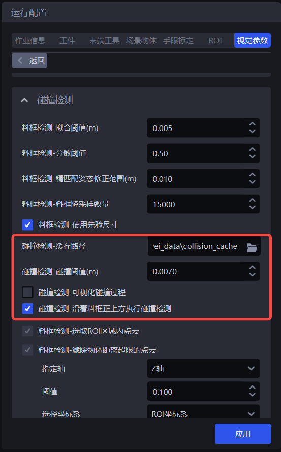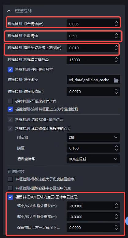 在视觉参数-3D计算-碰撞检测调整料框检测相关参数,具体可参考 2.1 料框检测。