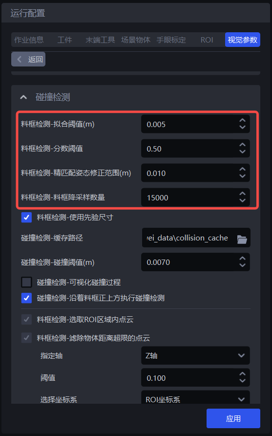 | 料框检测-选取ROI区域内点云 | 从实际点云中选取 ROI 3D 区域内点云 | 勾选 | / | 一般不调整 | |