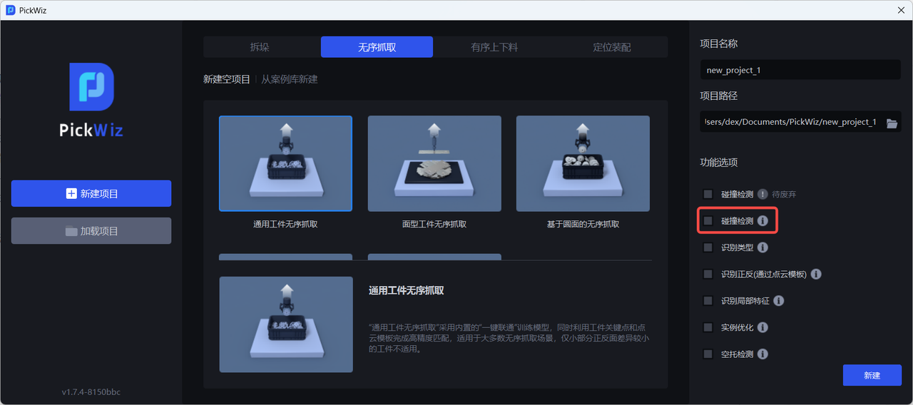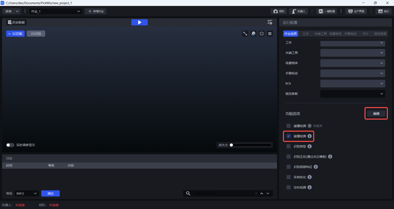 当实际场景中有料框,在新建项目时,勾选碰撞检测功能;若新建项目时未勾选,则在作业信息界面,点击右下方编辑,然后勾选碰撞检测并保存