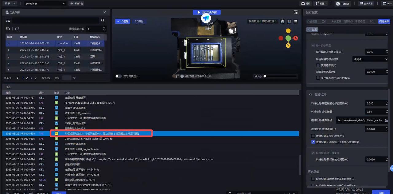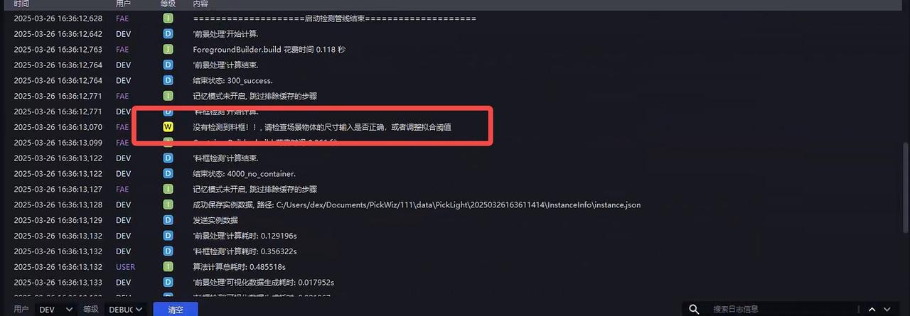 没有检测到料框,首先检查输入的料框尺寸是否正确,其次调整料框检测-拟合阈值(m)