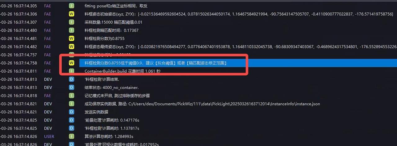 料框分数过低,若是正常识别,则修改料框检测-分数阈值,否则修改料框检测-精匹配姿态修正范围(m)