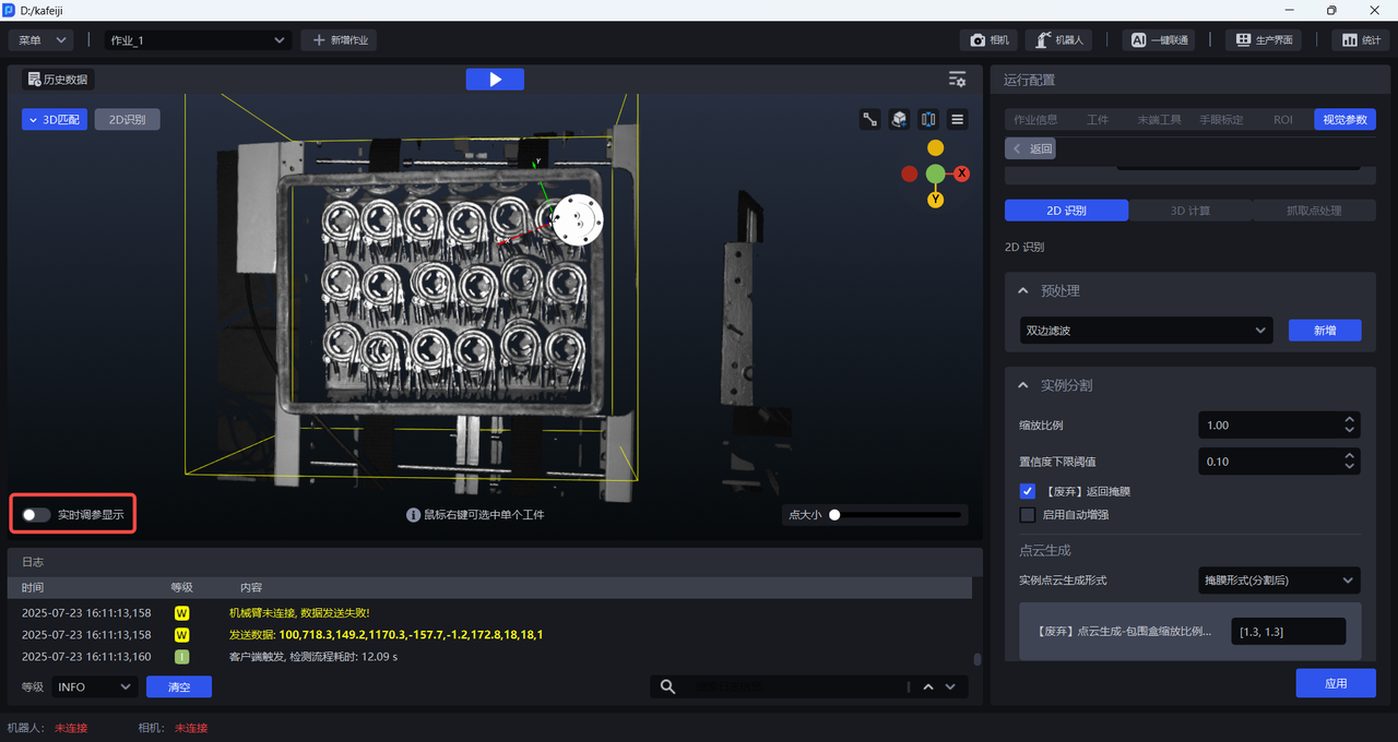 将作业信息各个配置项配置完成后,点击可视化视窗左下角的实时调参显示来开启实时调参模式。