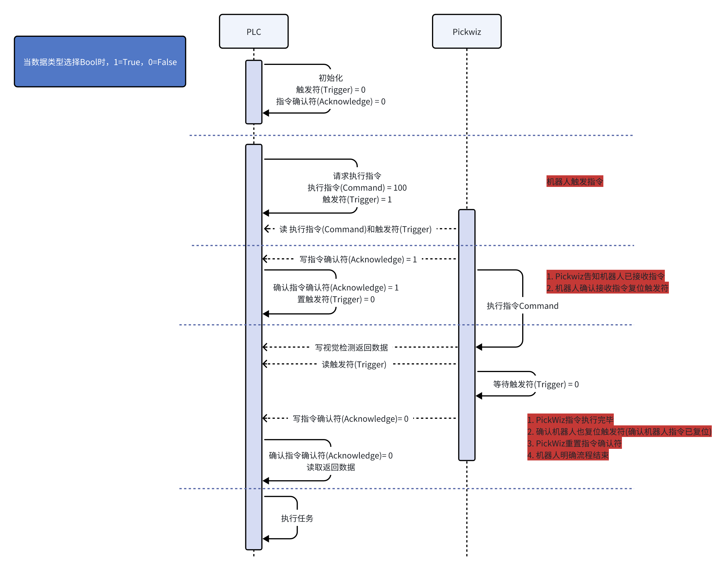 | 心跳 | 用于监控通讯状态。当机器人/PLC与PickWiz通信连接时, PickWiz向对应的地址块写入1;当机器人/PLC与PickWiz通信断开(PickWiz长时间未写入1)时,机器人/PLC向该地址块写入0 |