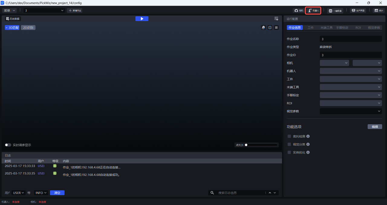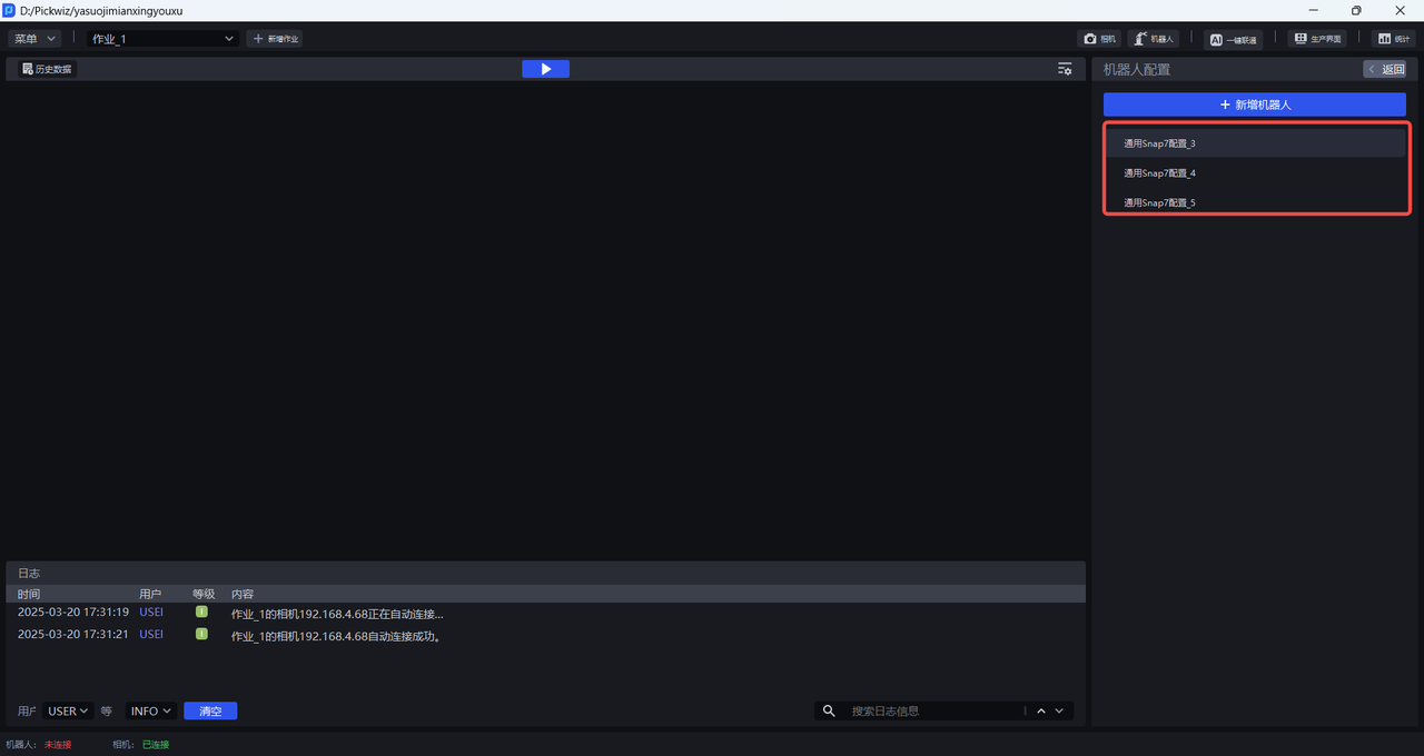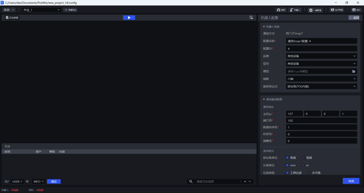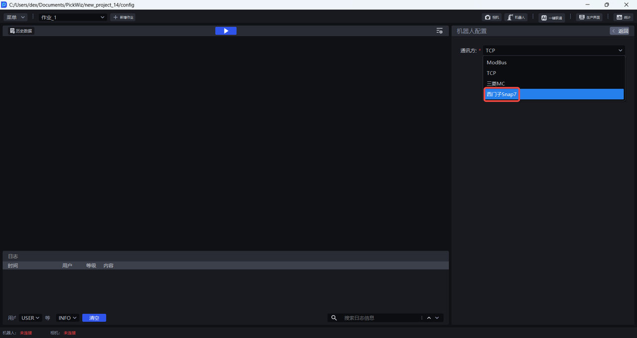 完成 西门子Snap7 通信配置后,可在作业主界面为当前的作业场景选择机器人配置,在机器人配置选择栏选择相应的机器人配置,PickWiz 将尝试与机器人通过 西门子Snap7 通信协议建立通信。
