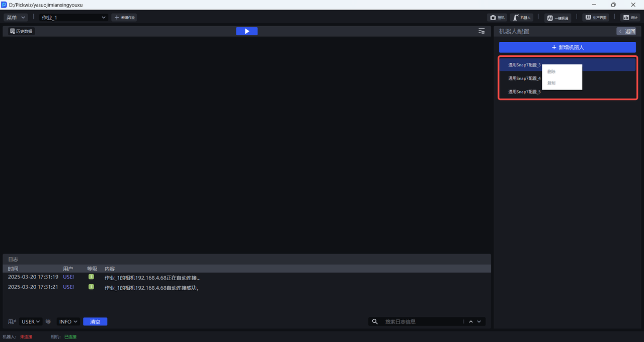 在 新增机器人 界面右键点击机器人配置可删除选中的机器人配置。
