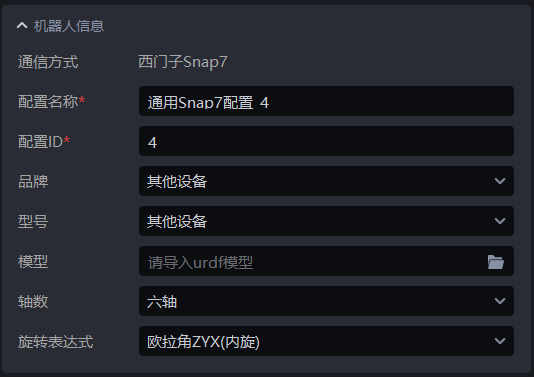 | 模型 | 品牌和型号选择其他设备时,需上传该设备的模型,模型文件的格式为urdf |