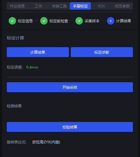 - 在“作业信息”界面切换FINCH相机的彩色/黑白坐标系时,原先配置好的手眼标定参数会自动转换,不需要重复标定;