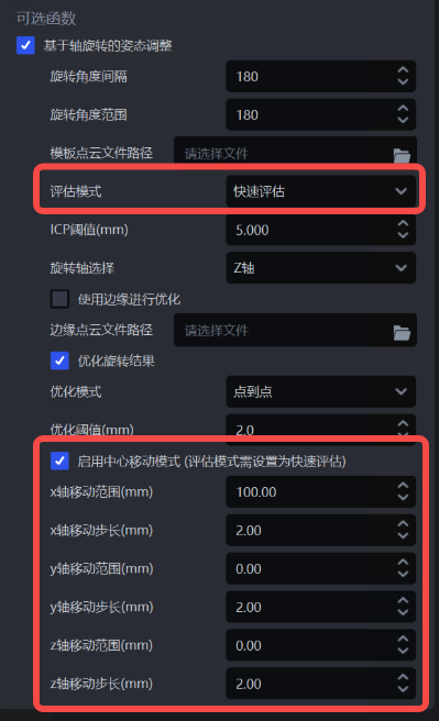 勾选启用中心移动模式时,需确保“评估模式”字段设置为“快速评估”,否则中心移动模式不生效;