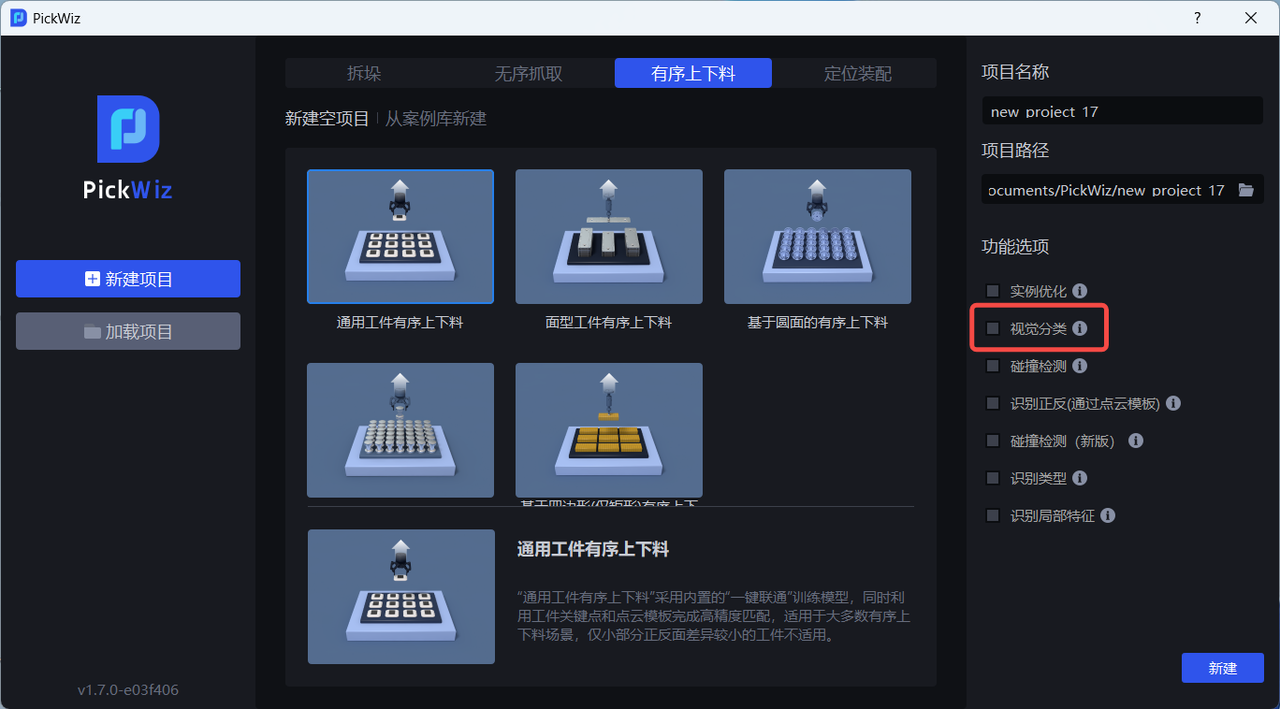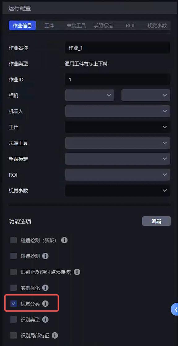当实际场景中的同一工件具有不同纹理、不同朝向或其他特征,在新建项目时,勾选视觉分类功能;若新建项目时未勾选,则在作业信息界面,点击右下方编辑,然后勾选视觉分类
