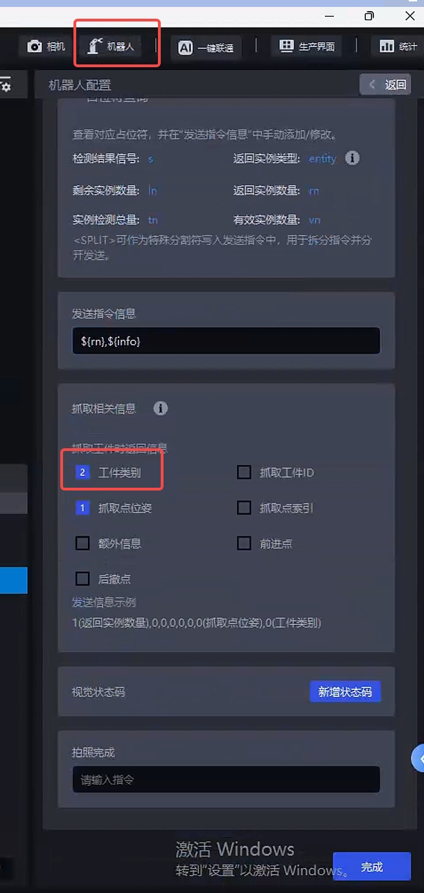 点击 机器人面板 打开机器人配置,在抓取相关信息中,勾选工件类别,机器人可以获取相关的类别信息