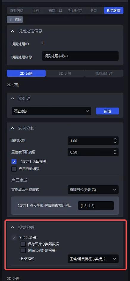 在作业信息选择好各配置项后,在视觉参数-2D识别-视觉分类调整参数