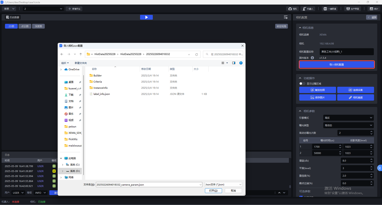 进入相机配置界面,点击导入相机配置可将已有的相机配置导入相机。