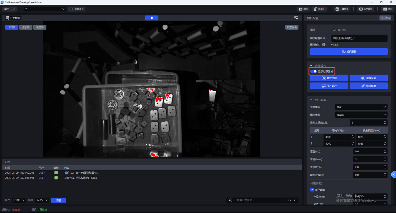 显示过曝区域查看相机成像的曝光程度,如有过曝区域应调整单曝光的曝光时间,确保相机成像曝光正常。校正完成后,应当将相机成像参数切换回原本的配置