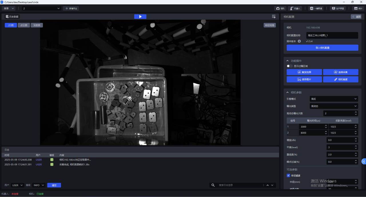 点击触发拍照,使用当前的相机配置拍摄2D图、点云图、深度图,可在可视化视窗查看当前相机配置的成像质量。