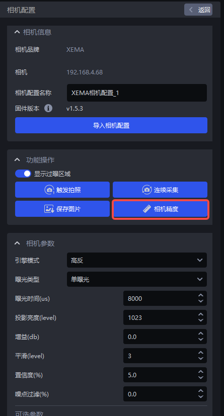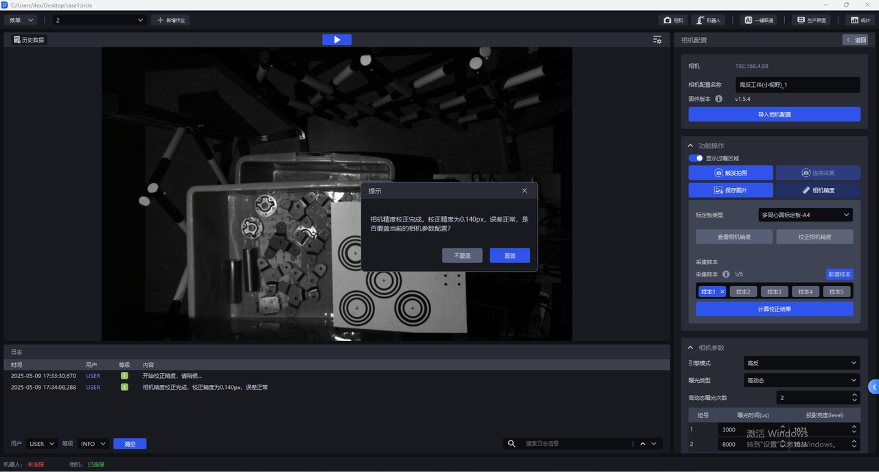 如选择覆盖当前的相机参数配置,会将相机精度校正结果更新到相机,需重启相机才能生效