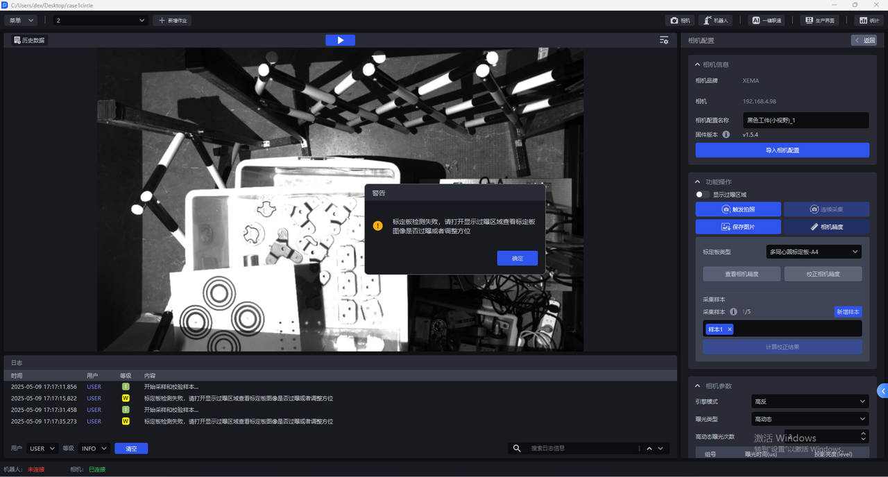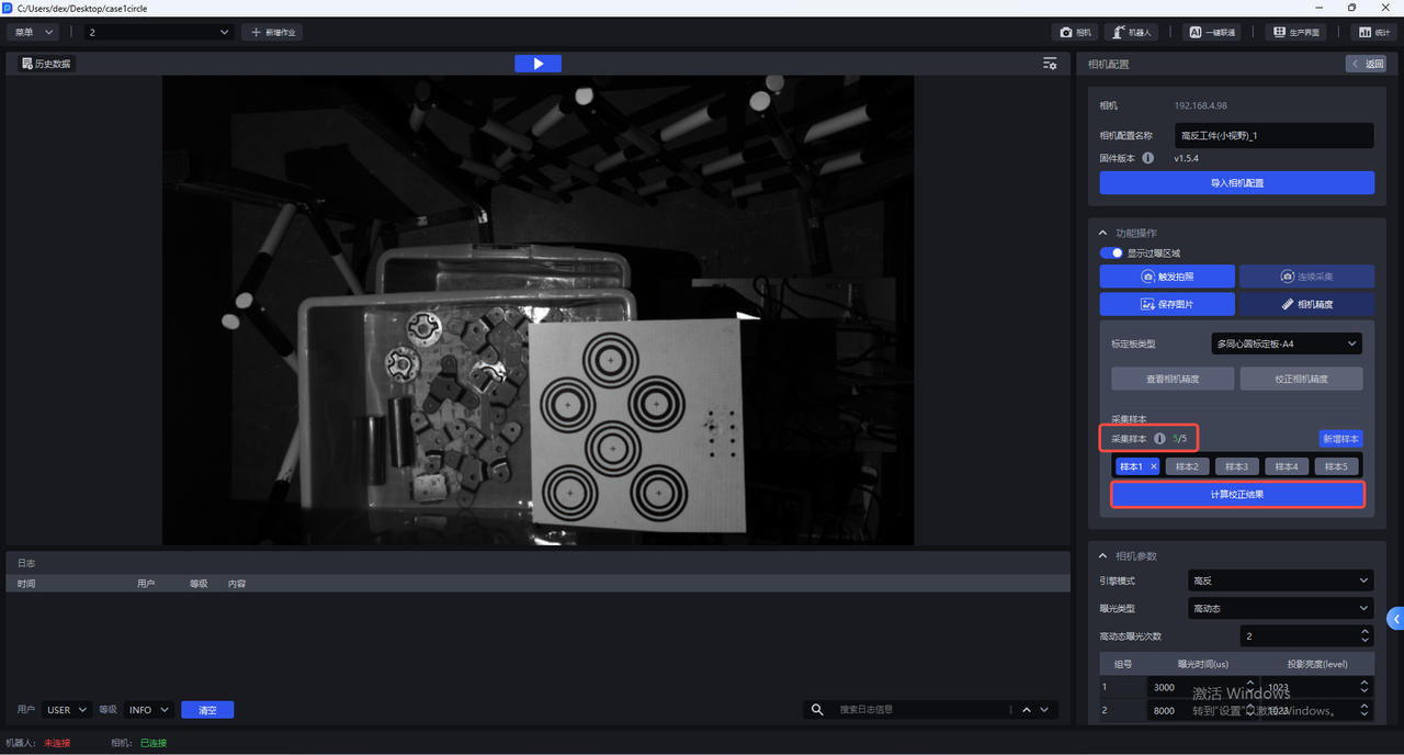 - 将标定板放置在相机视野内,在相机配置界面点击