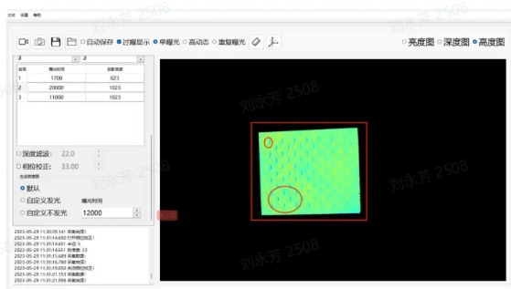 触发拍照,使用成像参数拍摄2D图、点云图、深度图,可在左侧的可视化视窗查看成像质量。