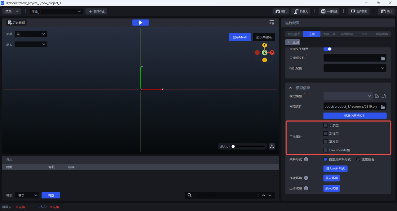一键联通训练视觉模型时,通用工件和面型工件依赖网格文件来渲染出大量不同视角、光照条件下的合成图像,扩充训练数据,这样可以提高视觉模型的泛化能力。若面型工件较为简单、特征较少,可不上传网格文件。