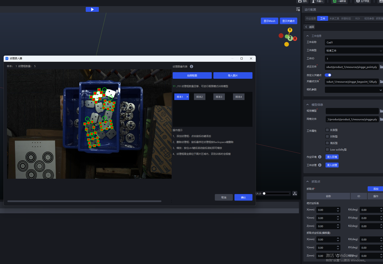 拍照取图采集相机视野下的作业环境,二是直接导入图片,作业环境图片不能包括工件和料框,可以包括托盘、底托。