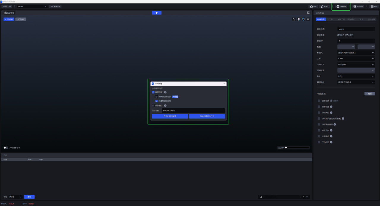 完成工件和ROI配置后,点击一键联通触发视觉模型的训练。如需对输入数据进行手动编辑,应选择仅导出训练配置;如不需编辑输入数据,应选择自动创建训练任务。