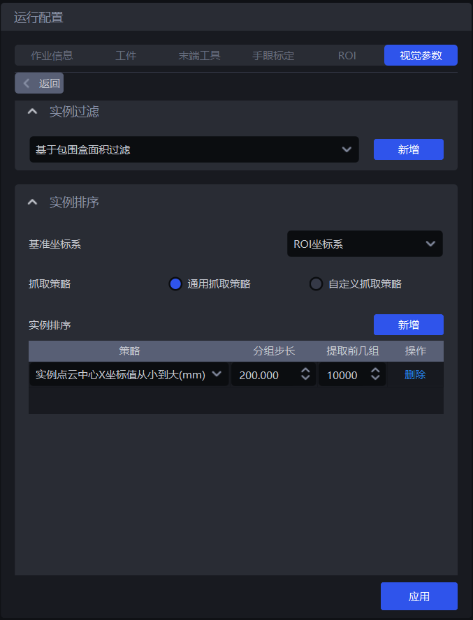 | 工件姿态XYZ值从大到小/从小到大(mm) | 使用3D匹配后的实例点云中心点的XYZ坐标值进行分组排序 使用该策略进行排序前应当先设置基准坐标系 | 200.000 | [0, 10000000] | 10000 |