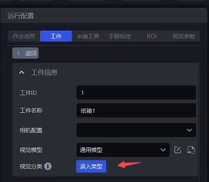 添加插件后,在工件界面新增工件,点击工件信息-视觉分类 的录入类型按钮,分别对工件、隔板和底托录入类型。