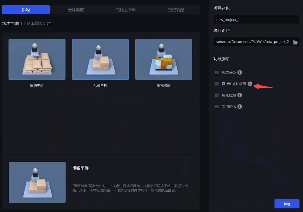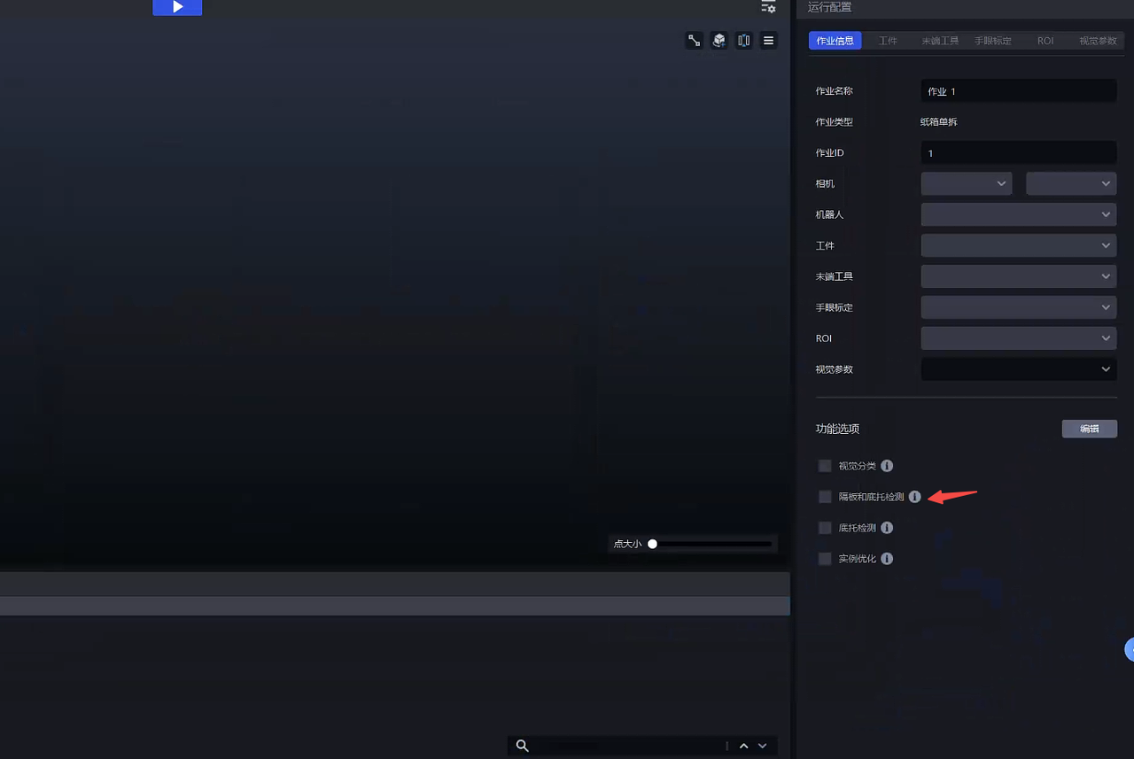 当实际场景中每层工件下均有隔板,在新建项目或者新建作业时,勾选 隔板和底托检测 功能;若新建项目或新建作业时未勾选,则在作业信息界面,点击右下方编辑,然后勾选隔板和底托检测
