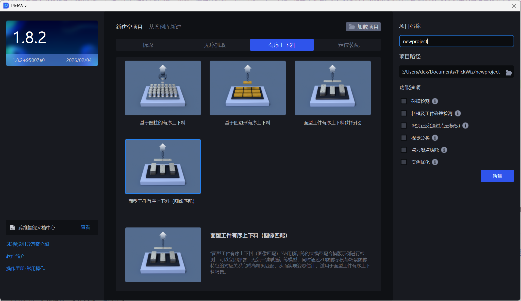 可选的功能选项有碰撞检测、料框及工件碰撞检测、视觉分类、点云噪点去除和实例优化