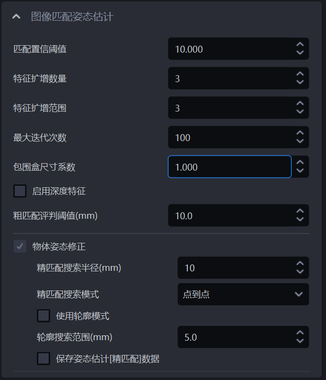 | 指定坐标系 | 选择要将姿态转换到哪个坐标系进行处理 | ROI坐标系 | ROI坐标系/相机坐标系 |