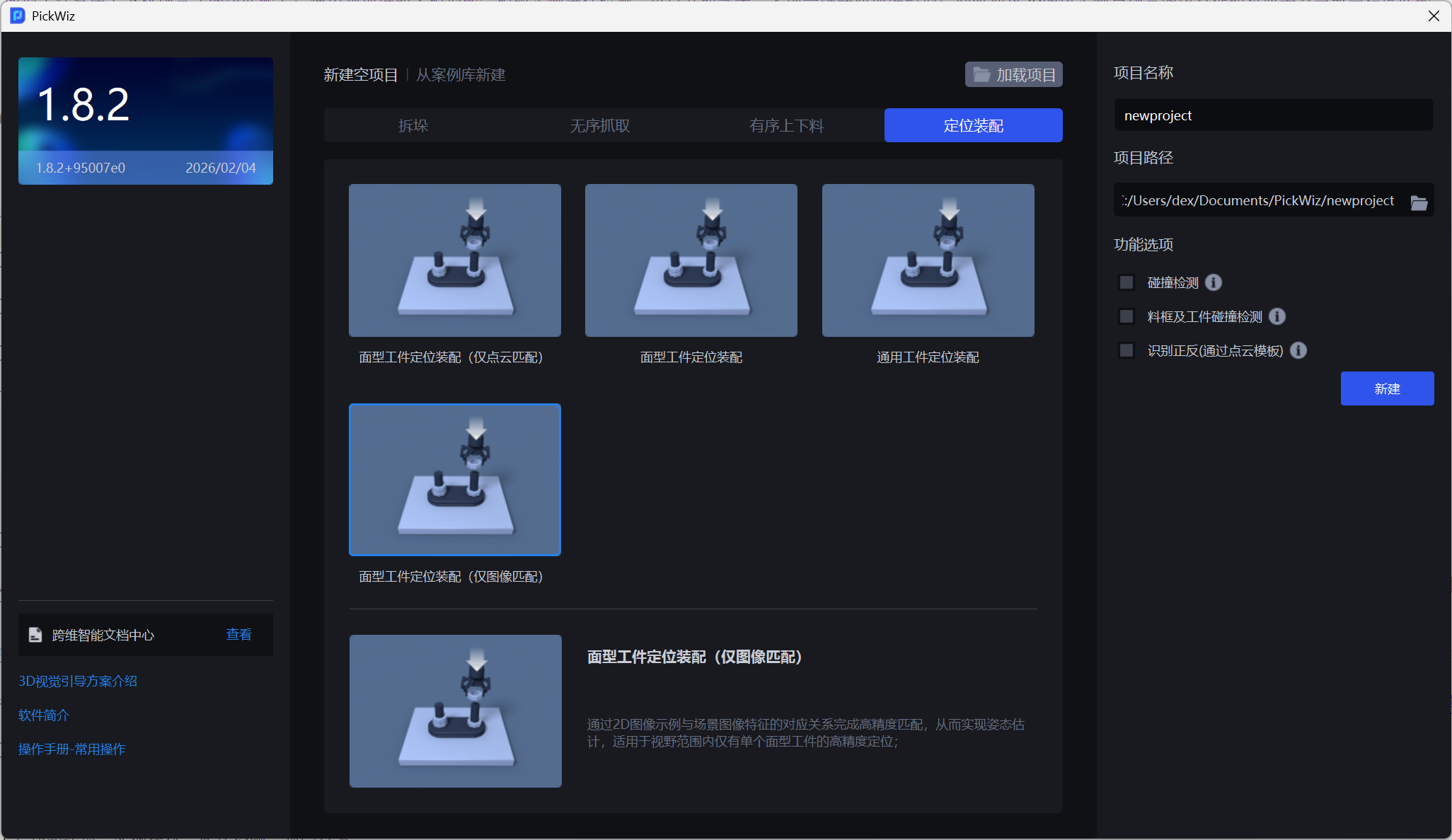 (1)新建一个面型工件有序上下料场景(图像匹配)/面型工件定位装配(仅图像匹配)项目(项目名称、项目地址可以自定义,项目名称不能有中文)