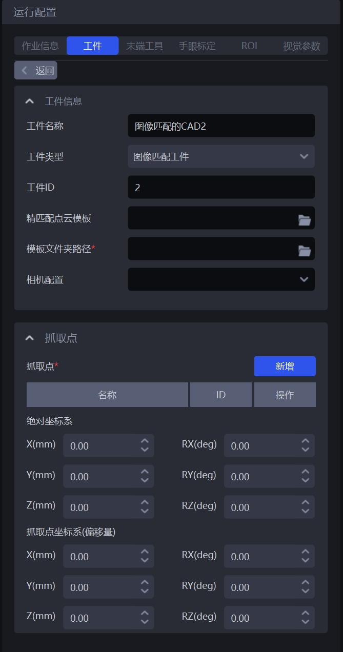 | 工件姿态缓存个数 | 缓存的视觉工件姿态个数,当前工件姿态比较完成后将实时增加到缓存中 | 5 | [1, 100] | / |