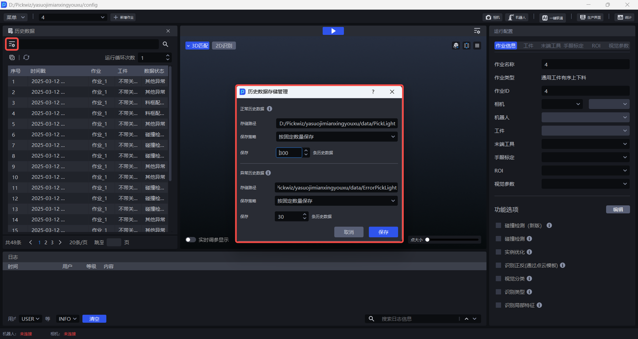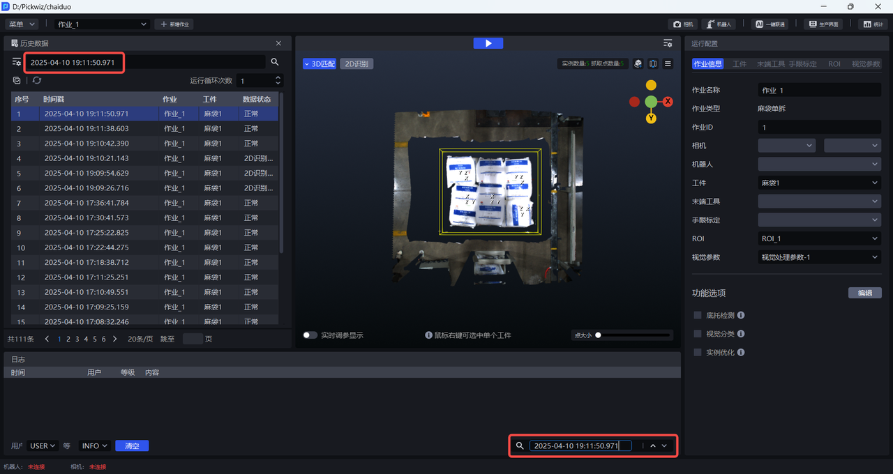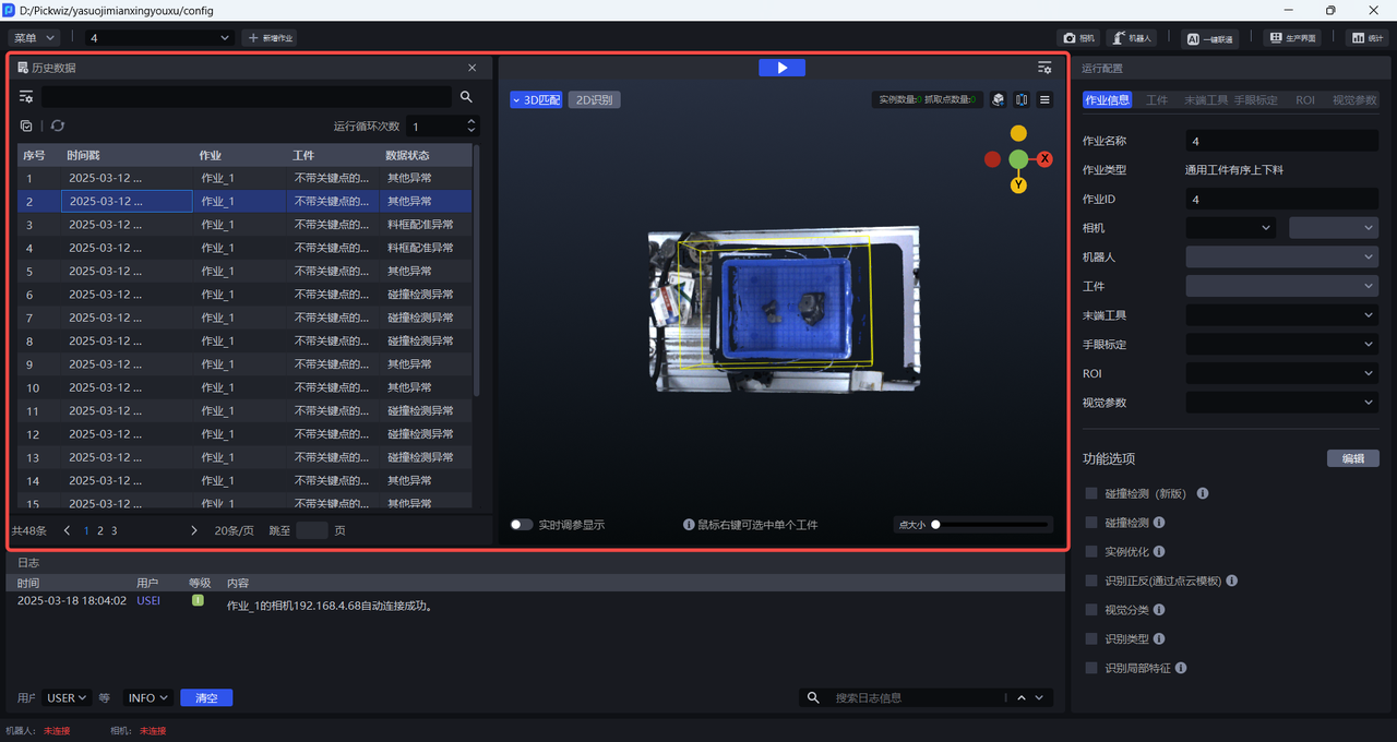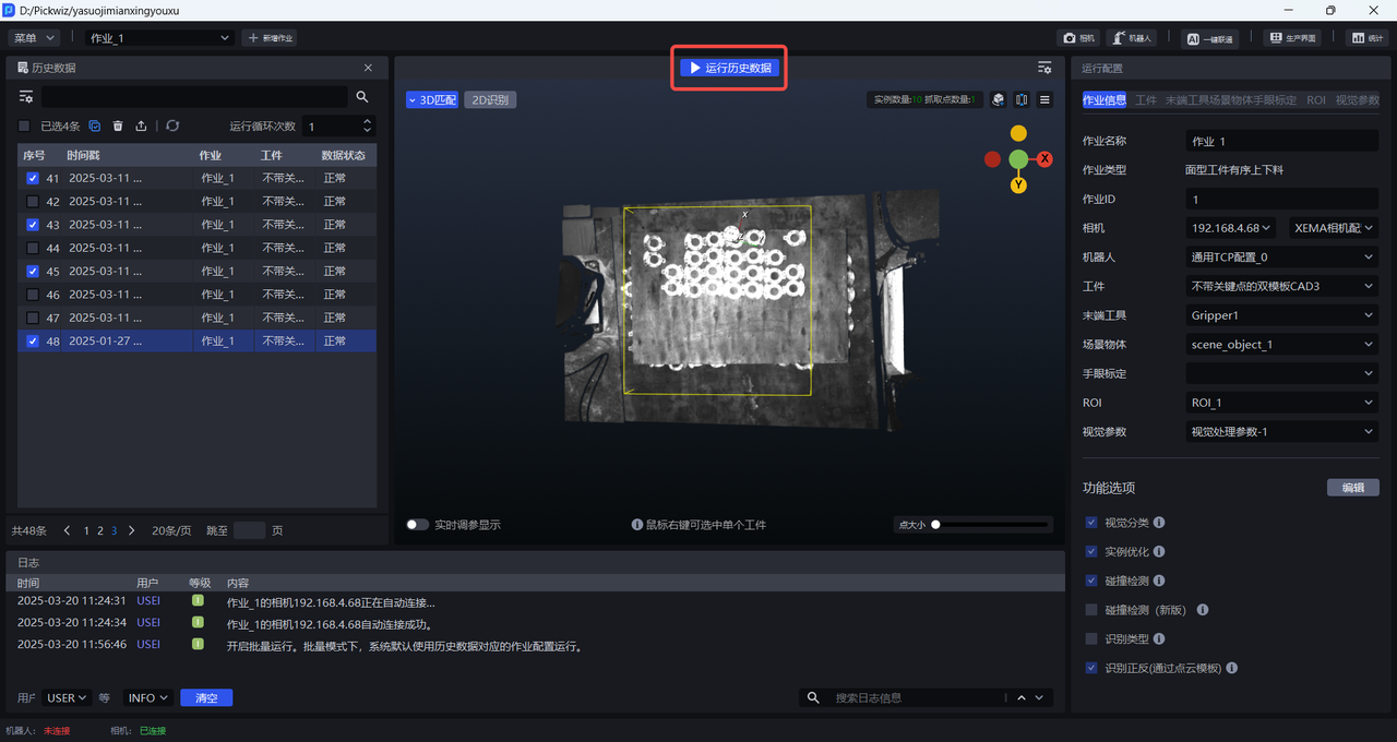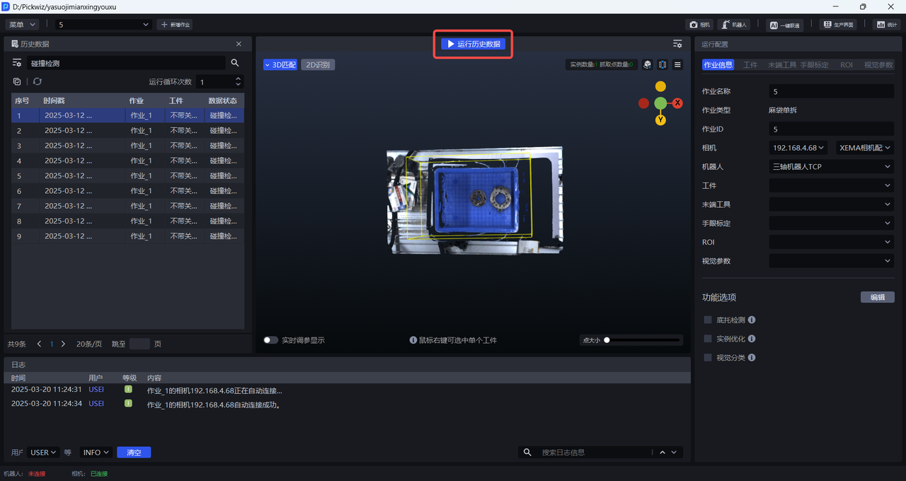 历史数据是 Pickwiz 过去一段时间内的运行记录,保存了2D识别、3D计算、抓取点处理各个过程的输入数据和输出结果,用于回溯异常问题。