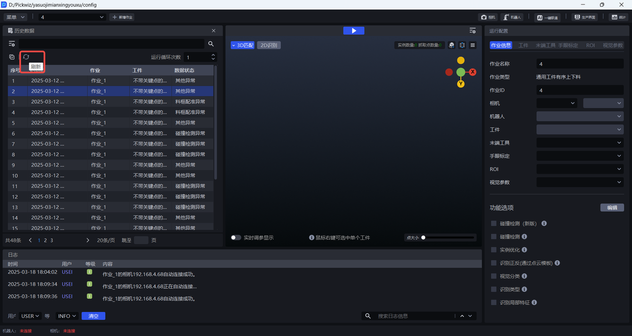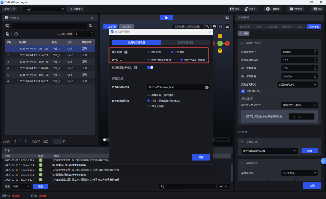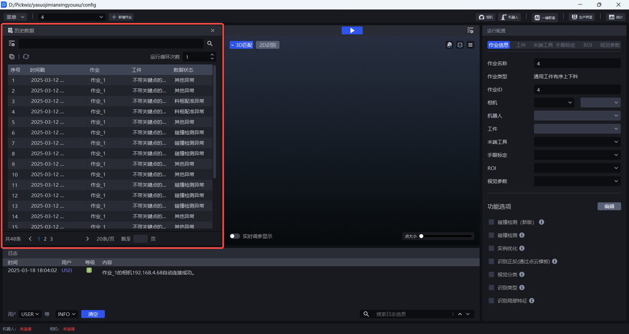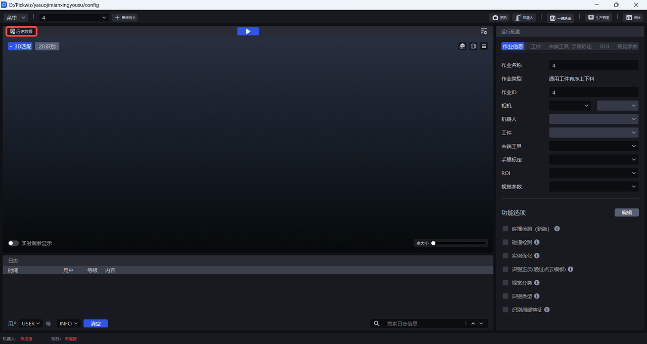 历史数据是 Pickwiz 过去一段时间内的运行记录,保存了2D识别、3D计算、抓取点处理各个过程的输入数据和输出结果,用于回溯异常问题。