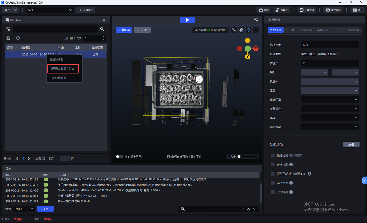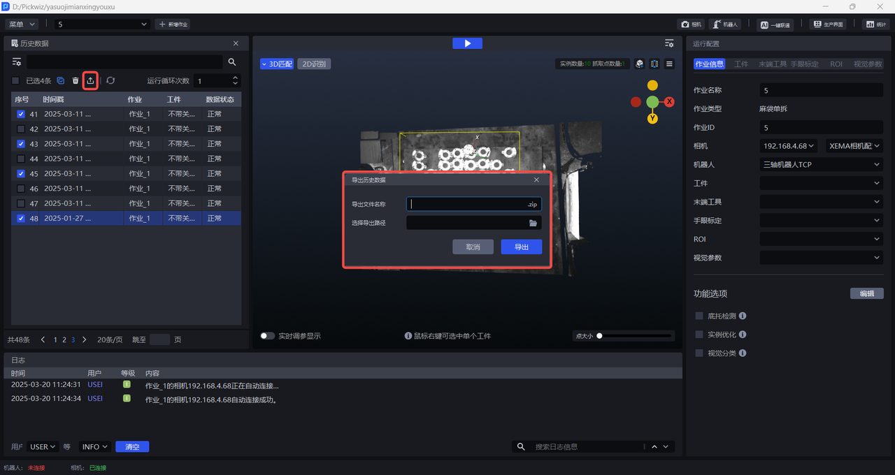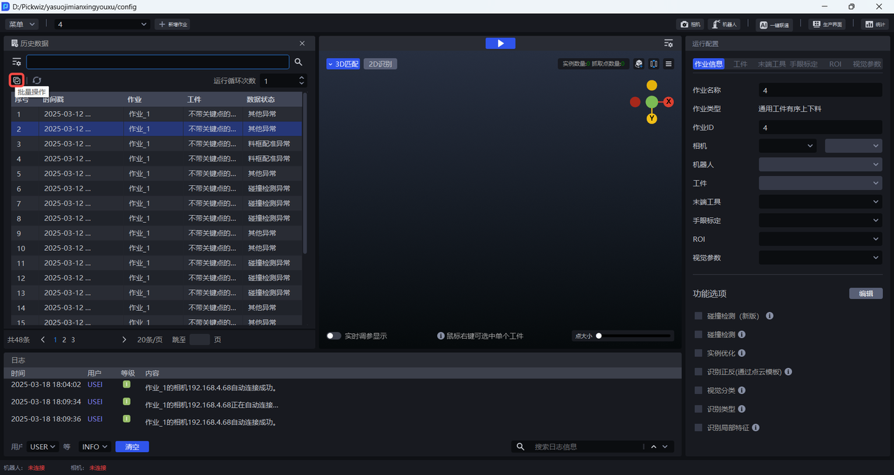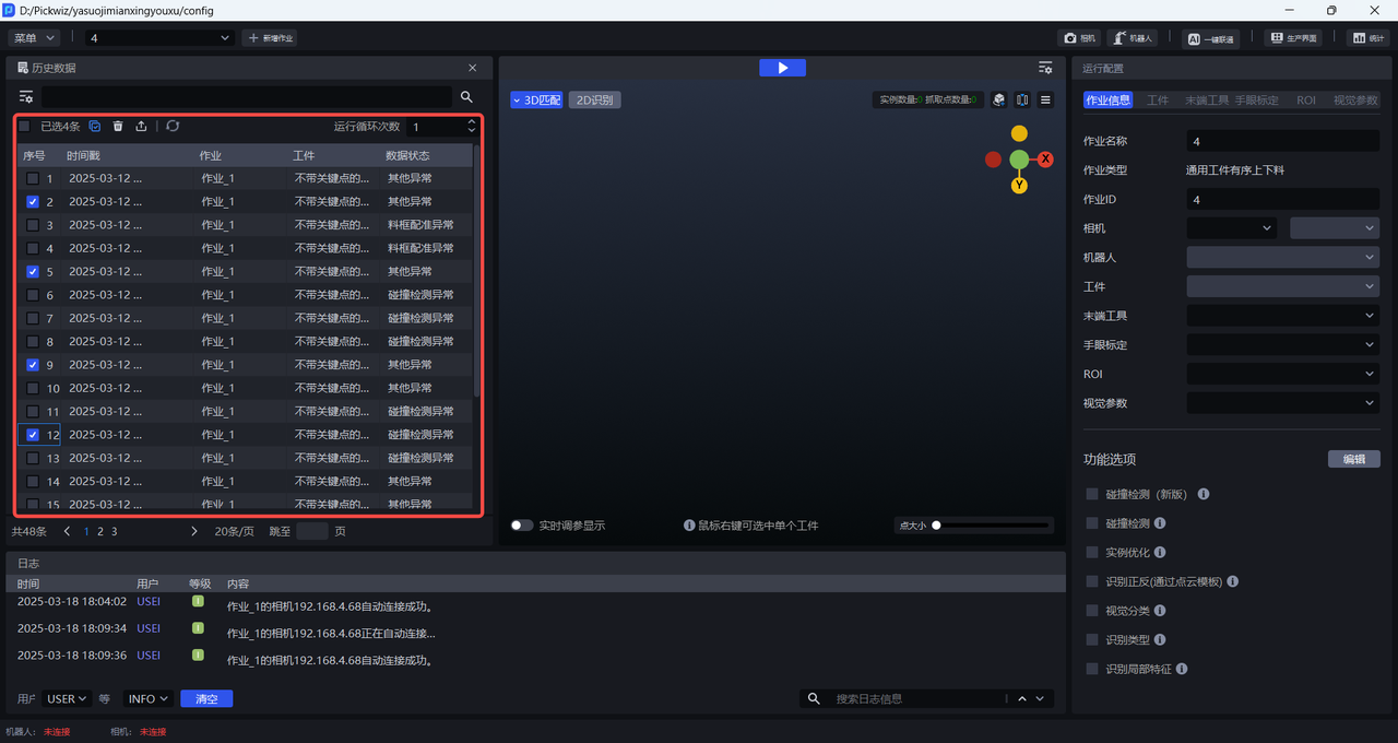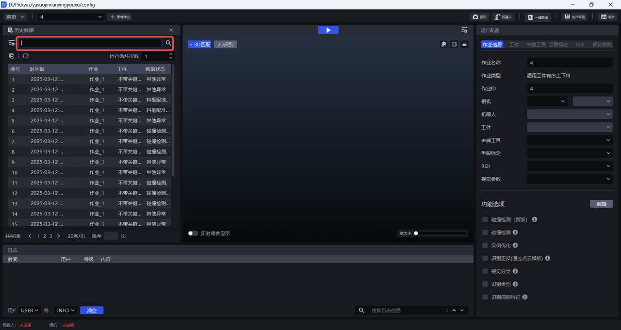 历史数据是 Pickwiz 过去一段时间内的运行记录,保存了2D识别、3D计算、抓取点处理各个过程的输入数据和输出结果,用于回溯异常问题。
