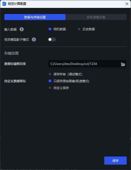 若视觉计算配置的自定义数据保存选择了只保存原始图像(极速模式),历史数据将不会保存点云数据,导致ROI区域和点云模板都无法调整,如下图所示。(ROI相关说明请参照 ROI 操作指南,点云模板相关说明请参照 点云模板制作指南)