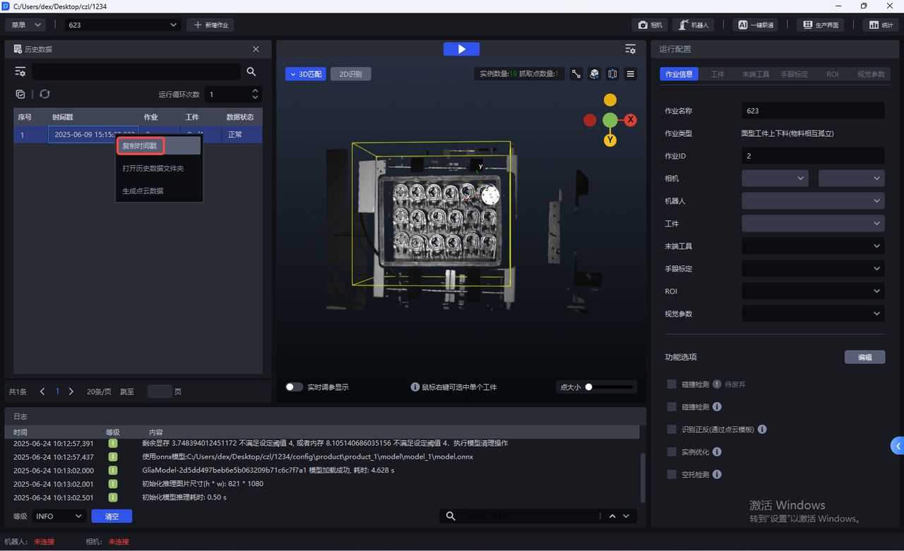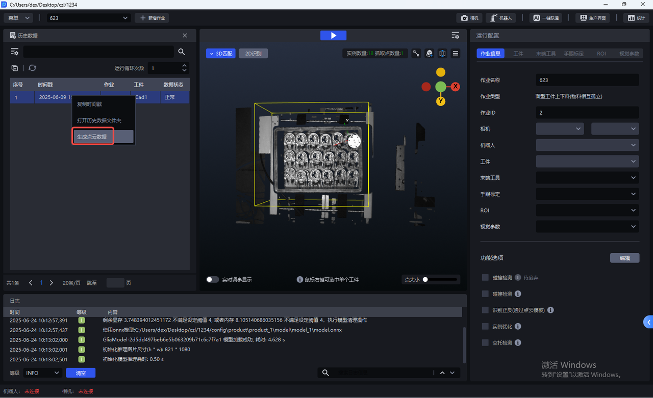 - 如需查看该条历史数据的2D识别结果和抓取点,可点击 运行完整的视觉结果,这种运行方式会再次保存该条历史数据重新运行的完整记录,如下图所示。