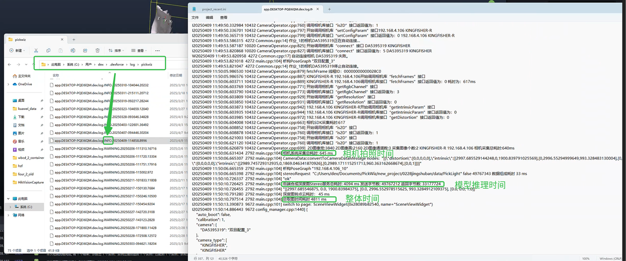 A:双目相机取图时间(仅拍照、模型推理,以及整体时间)日志记录在路径:C:\Users\dex\.dexforce\log\pickwiz,找到时间最近的INFO日志,用记事本打开
