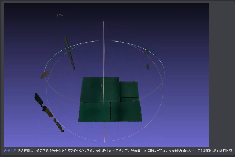 可能原因: 这类情况大多数是因为使用了不同的作业/ROI3d时出现,由于当前历史数据的点云与当前使用roi不一致,可能造成实例点云的上方加入很多噪点,从而抛满检异常。