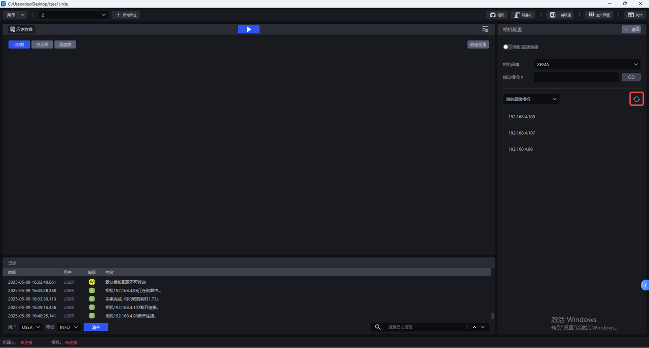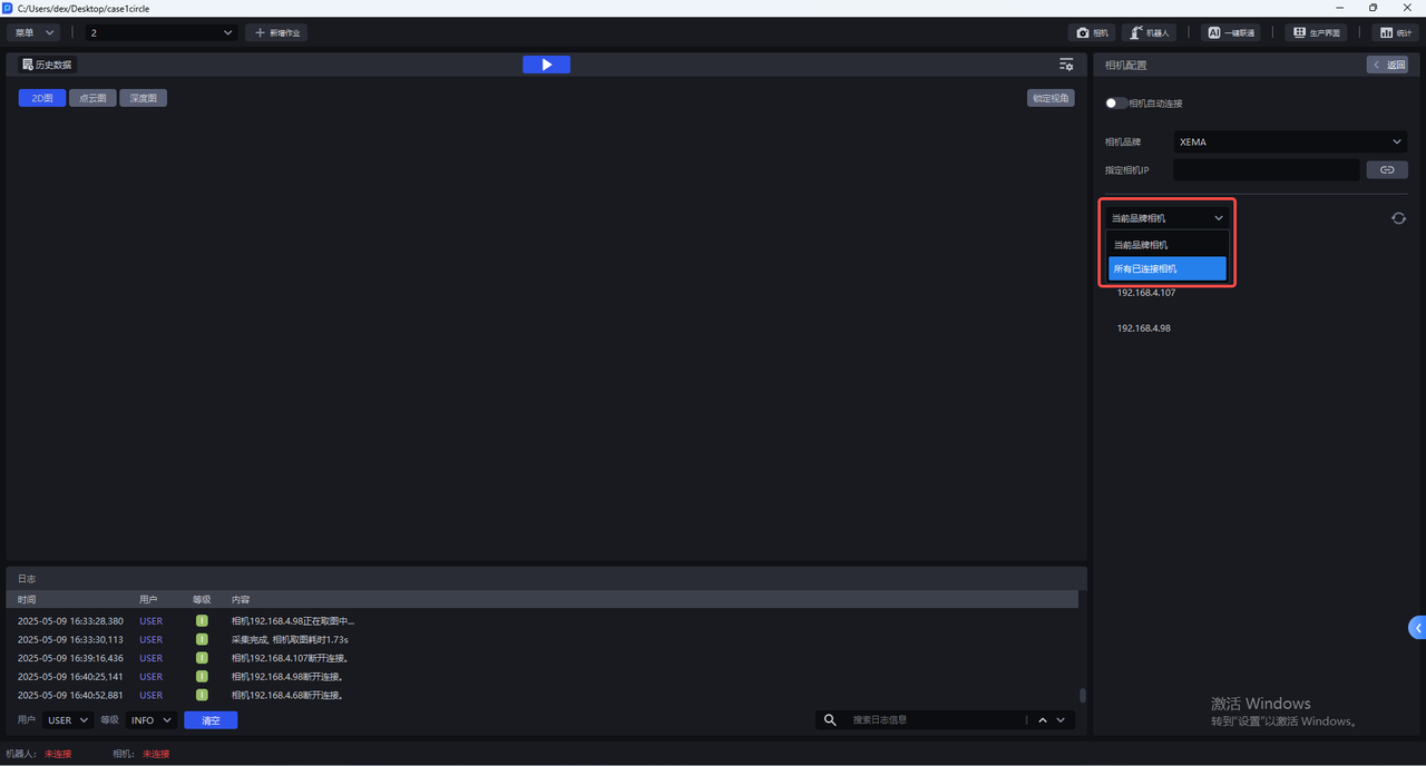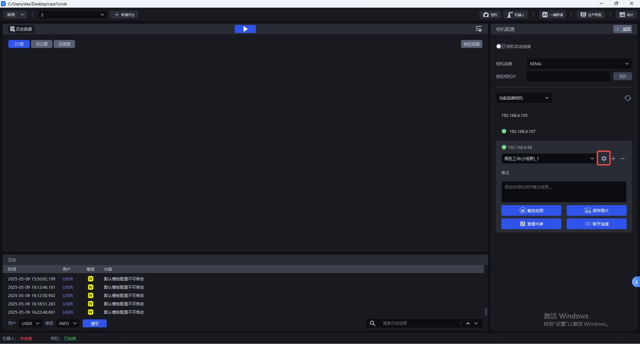 作业信息界面为当前作业选择相机,选择相机后,状态栏的相机连接状态变为"已连接",如下图所示。