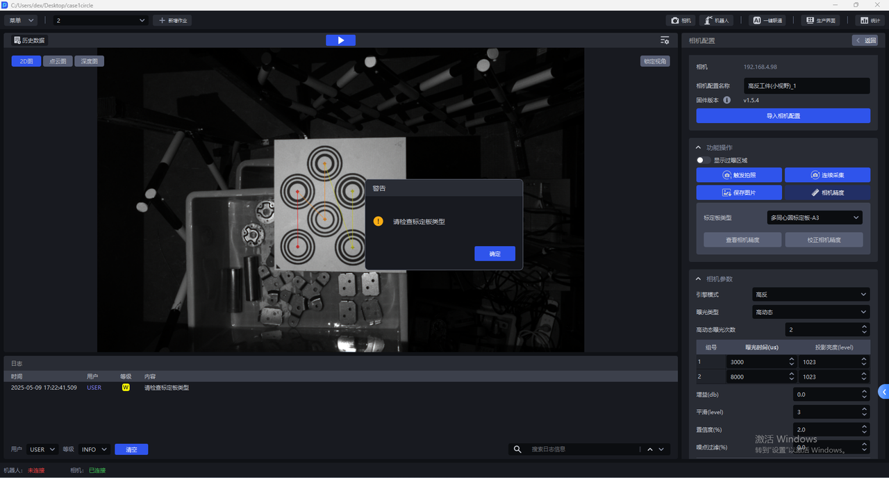 查看相机精度,PickWiz会自动计算当前相机的相机精度,若相机精度符合要求,则直接调整相机成像参数;若相机精度过大,会弹窗提示框"误差过大,建议校正相机精度"。