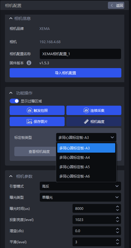 - 将标定板放置在相机视野内,在相机配置界面点击