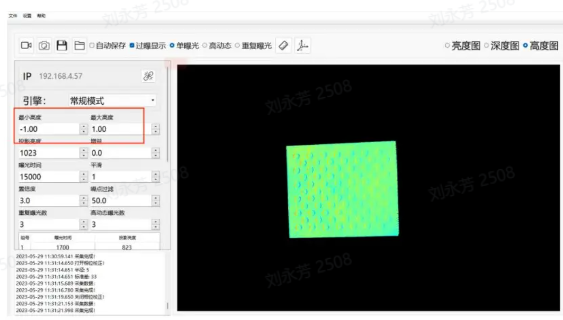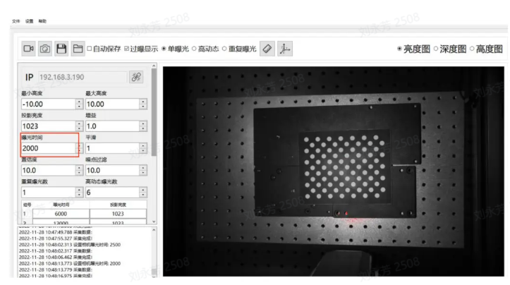 相机曝光时间:曝光时间是景物的反射光线通过镜头到达成像感光材料上,快门所要打开的时间。曝光时间越长,进入的光线越多。曝光时间过长则会出现过曝现象,从而影响点云,应结合实际调整大小