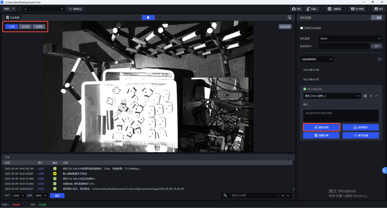 触发拍照,使用成像参数拍摄2D图、点云图、深度图,可在左侧的可视化视窗查看成像质量。
