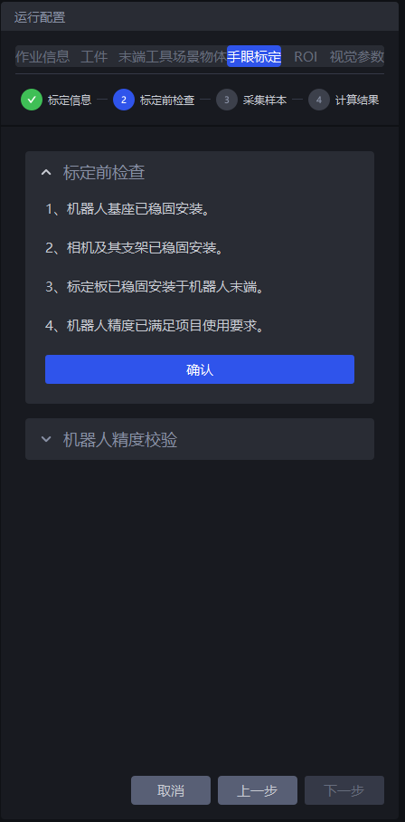 标定前检查:检查机器人、标定板等是否完成安装并满足标定要求;
