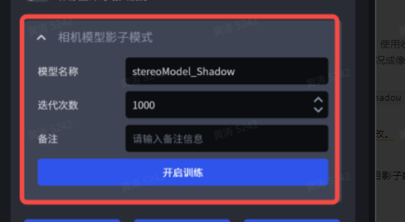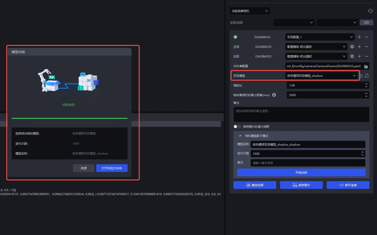 在主界面点击相机,进入相机,配置界面连接双目相机,滚动条下滑至影子模式