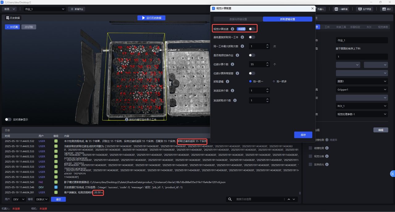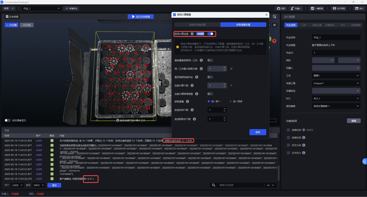 开启 “视觉计算加速” 模式时,“避免重复抓取同一工件”、“同一工件最大抓取次数”、“是否高频切换作业”、“位姿计算个数”、“位姿计算异常报警”无法生效。