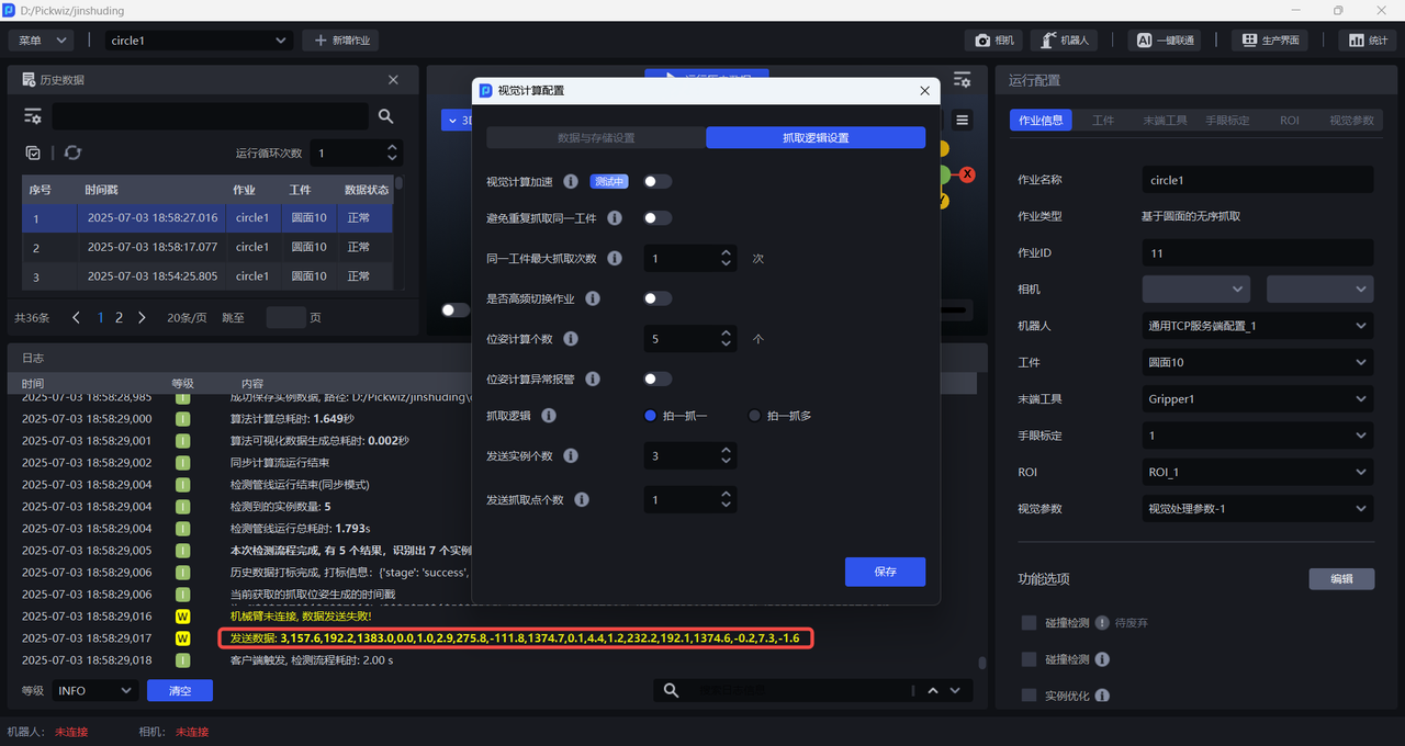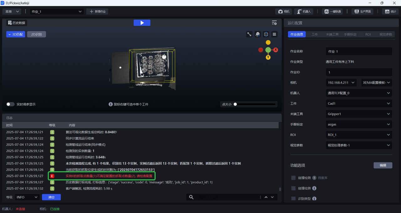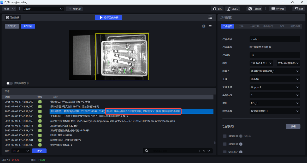 如下图所示,不勾选拍一抓多时,机器人每一次触发检测流程,PickWiz都要重新进行拍照计算。